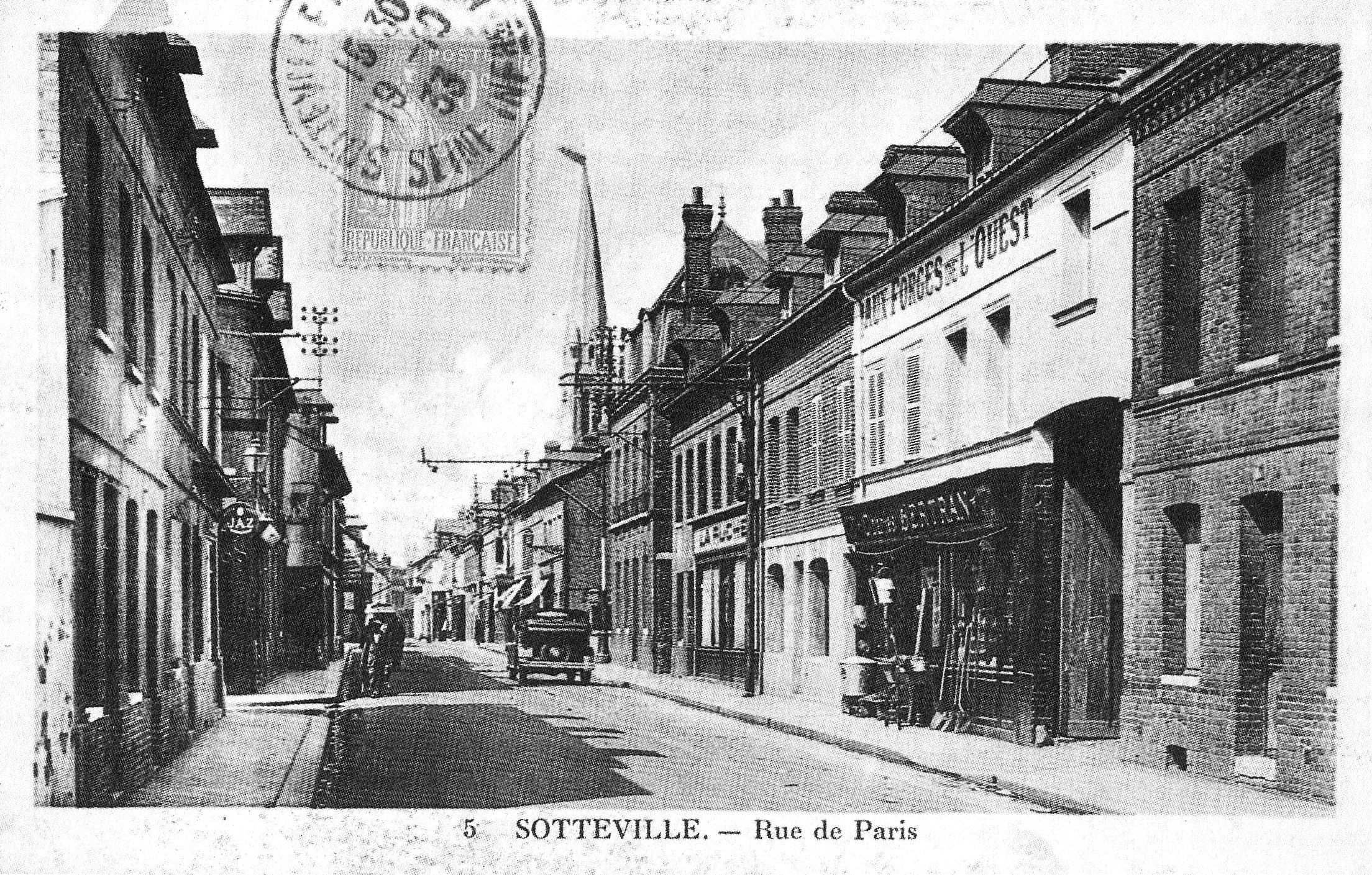 Sur la reproduction de carte postale, le cachet indique 1933. Sur cette photo, on distingue les rails du tramway qui passait par cette rue, et le clocher en pierre de l’église Notre Dame de l’Assomption. Après le bombardement de l’église, il a été reconstruit en cuivre, ce qui lui donne cette couleur. Le magasin de bricolage « Aux Forges de l’Ouest » n’a fermé que dans les années 90.