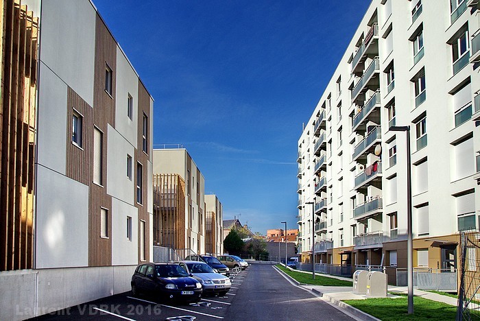 Sur cette vue d’ensemble (2012), la nouvelle rue est représentée en rouge et les trois nouveaux immeubles en beige.