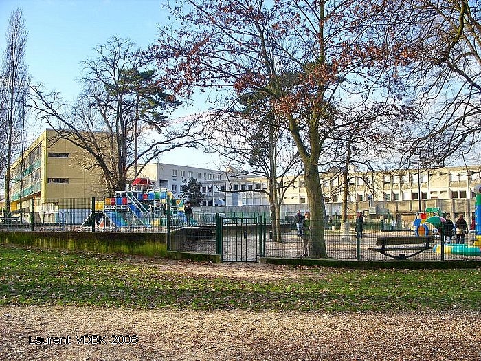 2/ La clôture ayant été repoussée jusqu’au milieu du parc de jeux, celui-ci a été déménagé un peu plus loin (à l’emplacement que nous connaissons aujourd’hui). Quelques arbres ont été plantés, mais sont loin de remplacer les deux très beaux et grands qui trônaient au centre du parc de jeux (on aperçoit leurs branches dans le coin en haut à droite de la photo) :