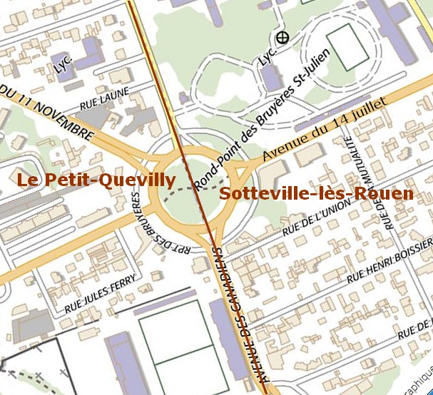 Avant que le Rond-Point des Bruyères ne soit de nouveau modifié (à cause du tracé de la future ligne T4 du Téor), le voici aujourd’hui :Rond Point des Bruyères - Sotteville-lès-RouenPlan actuel du quartier, en conservant la même orientation que celle des 6 photos :