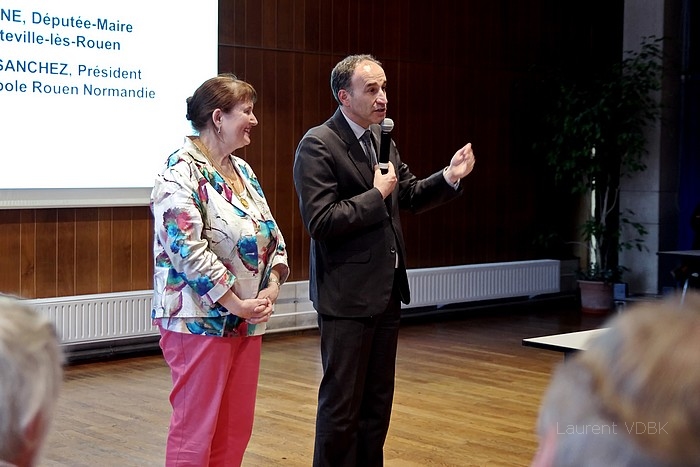Elle a été introduite par Luce Pane, députée-maire, et Frédéric Sanchez, président de la Métropole de Rouen, qui ont rappelé un peu l’histoire de cette place (créée au début des années 60 lors de la Reconstruction de la ville qui a été bombardée à 70% pendant la seconde guerre mondiale), et le cahier des charges assez contraignant : favoriser les cheminements piétons dans un cadre agréable, conserver les fonctions de la place (accueil du marché, des grands événements, parking gratuit, traversée des voies de circulation automobile…), effectuer les travaux (plus d’un an) sans se priver d’aucune de ces fonctions…