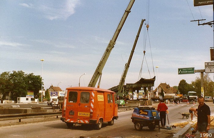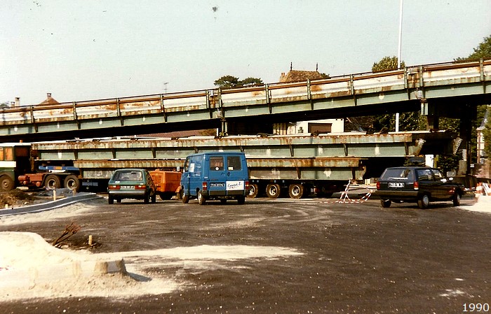Commençons par se remémorer le Rond-Point des Bruyères et son autopont (bien avant sa démolition sur cette photo) :