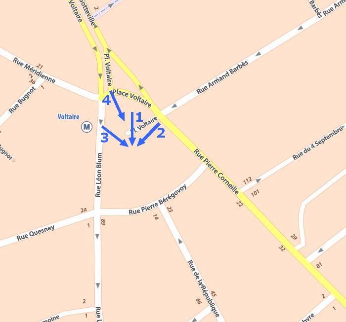 Le tracé des rues a aussi été modifié, avec le percement de la rue Pierre Bérégovoy, et surtout (puisque c’est cela qui nous intéresse pour cet article) la fermeture de l’accès à la place Voltaire par la rue de la République.