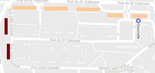 Pour se repérer sur les photos anciennes, ce petit plan restreint aux limites du chantier montre en bordeaux les deux immeubles qui sont presque construits et en saumon ceux qui sont à peine sortis de terre :