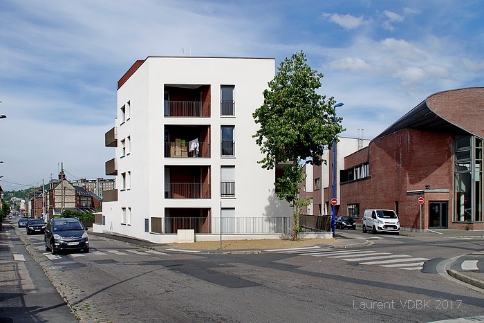 Situé à l’angle des rues Léon Salva, Frères Canton et des Déportés à Sotteville-lès-Rouen, le petit immeuble provisoirement nommé « L’Orée du Bois » a finalement pris le nom de « Résidence Laure Diebold » (résistante française) lors de sa livraison…