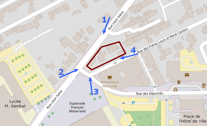 Ce plan du quartier vous aidera a comprendre la situation de la résidence Laure Diebold (en rouge) et les angles de vue des quatre avant/après :