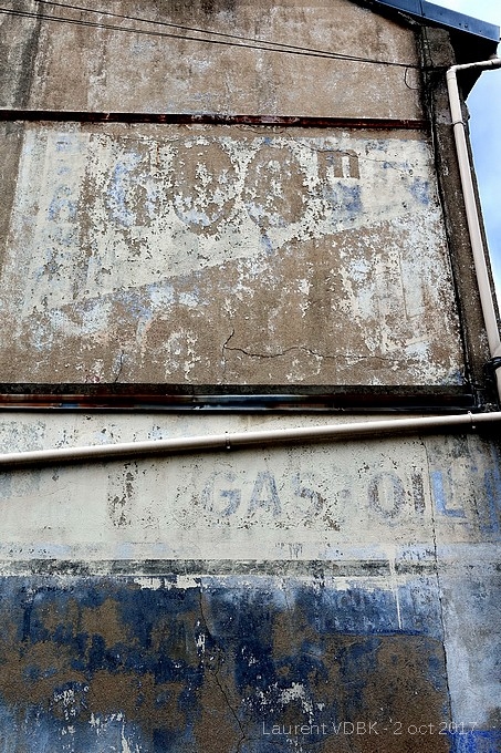 Des traces d’une publicité peinte qui indiquait une station service à 600 mètres, vendant notamment du « gas-oil » :