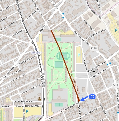Pour situer, nous sommes ici rue Raspail, avec à gauche la rue Victor Hugo. A droite nous observons l’amorce d’une rue sur la photo d’époque, absente sur la photo de 2017 : il s’agit de la rue de la République qui débutait ici, traversait tout ce qui est maintenant l’Espace Marcel Lods pour rejoindre le tronçon encore existant de la rue de la République.