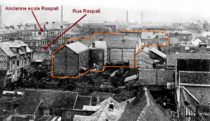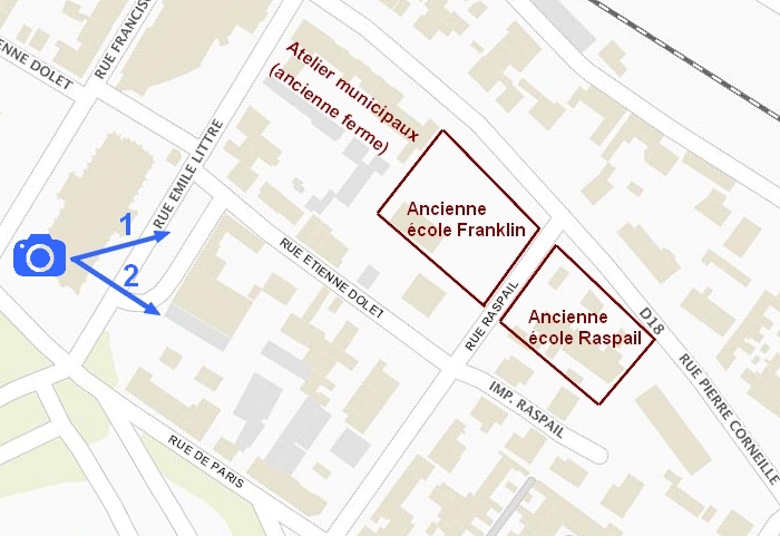Sur le montage ci-dessous, l’école Franklin a été collée à son emplacement, là où sont les actuelles salles paroissiales à l’angle des rues Raspail et Corneille (voir aussi le plan tout en bas de cet article).