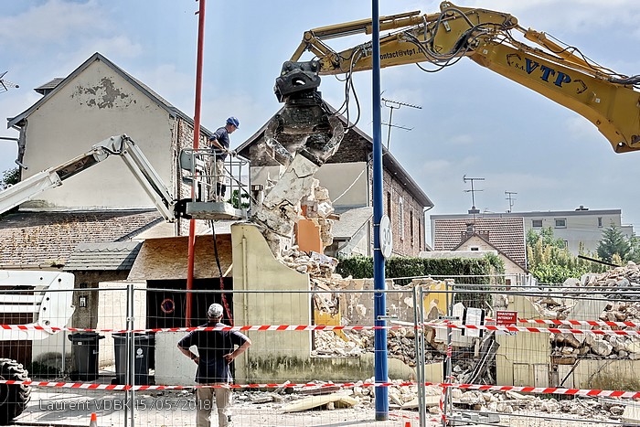 14 mai 2018 ► Démolition de l’ancien bar « Le Réveil Matin ». Un bref instant, on a pu découvrir une vieille enseigne peinte à même le mur, sous l’enseigne en plastique :
