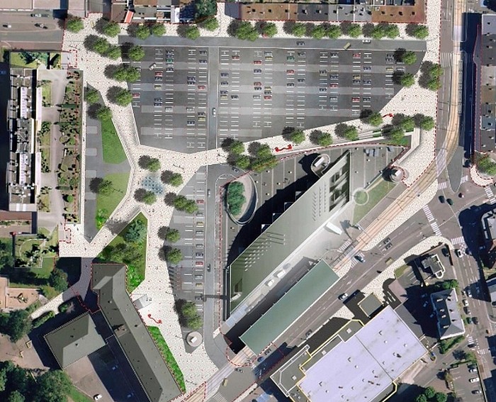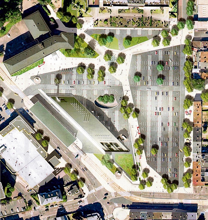 La perte d’emplacements à cause des allées (que ce soit stationnement ou marché) est compensée par des espace inoccupés pour l’instant (bien visibles sur la première illustration) : devant la mairie et autour de l’accès au parking souterrain.