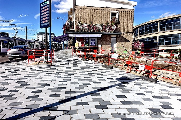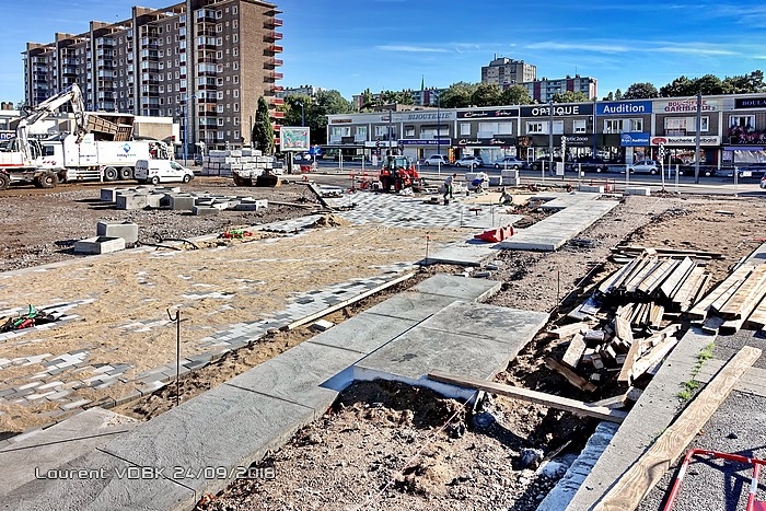 Mi-septembre 2018 : début du pavage du chemin piétonnier qui traversera la place :