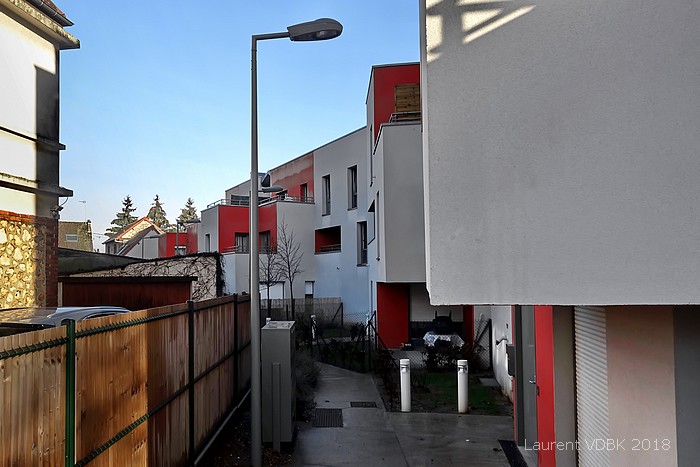 2ème avant/après : l’intérieur de la cour du garage en 2012, puis au même endroit, l’entrée de la résidence en 2018. La clôture avec le Café des Sports longe le bord gauche des deux photos :