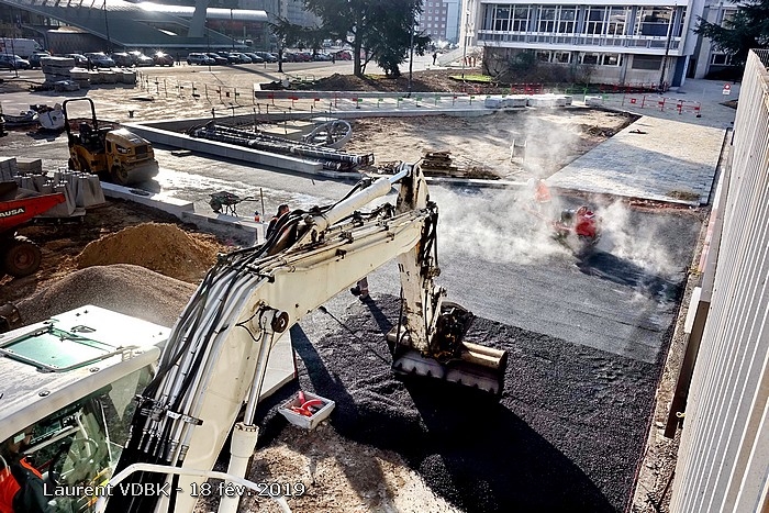 Le pavage de la place se poursuit avec les allées le long des commerces situés sous la terrasse de l’ILN. Toujours une couche de bitume au préalable :