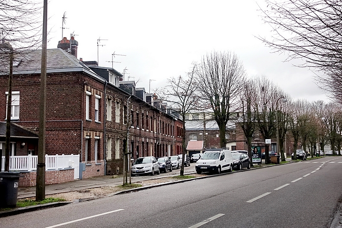 Vous êtes-vous déjà demandé pourquoi cette rangée de maisons n’est pas parallèle à la rue Pierre Corneille, et pourquoi on devine même un angle de rues avec la maison qui est derrière les arbres sur cette photo ?