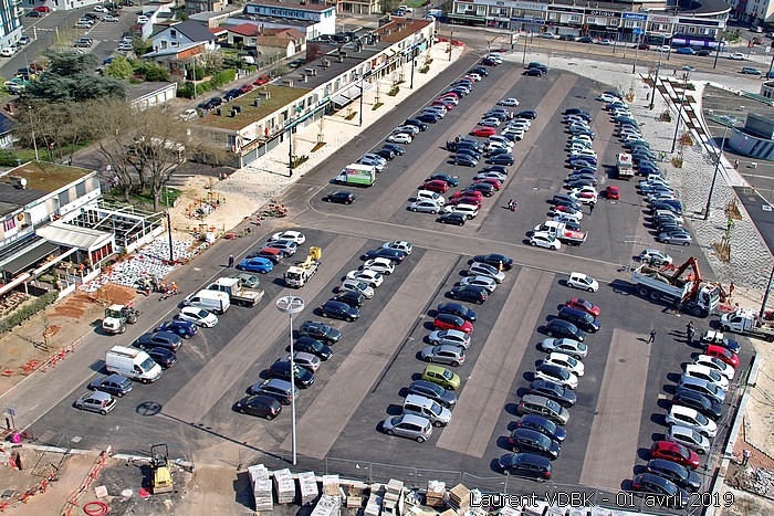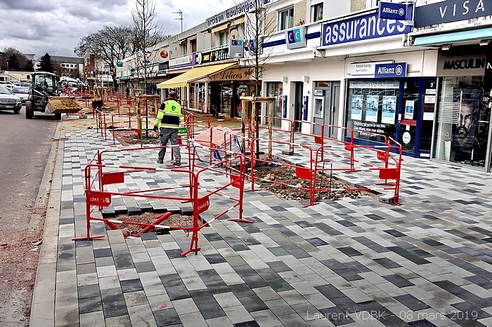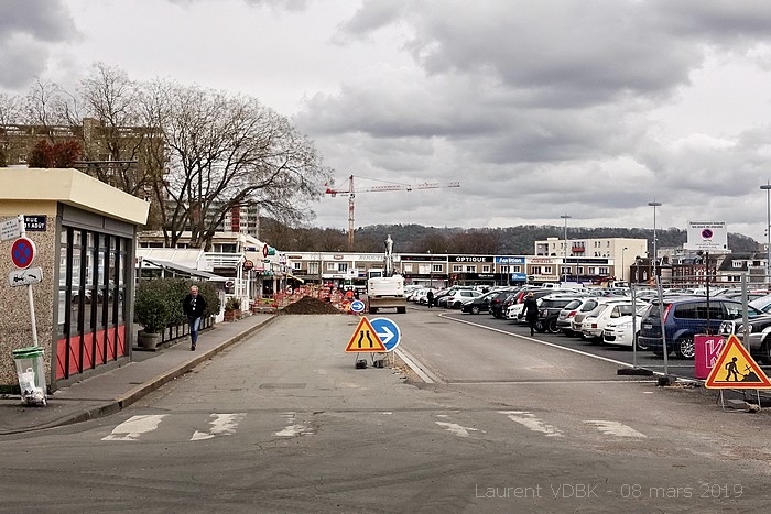 Travaux place de l'Hôtel de Ville de Sotteville-lès-RouenÀ gauche, l’ancien trottoir (étroit !). Au centre, l’ancienne route en train de devenir trottoir (bien plus large !). À droite, la nouvelle route :