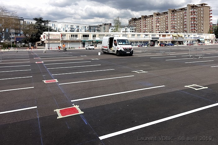 Des bandes plus claires ont été tracées sur le bitume pour marquer les emplacements des commerçants du marché :