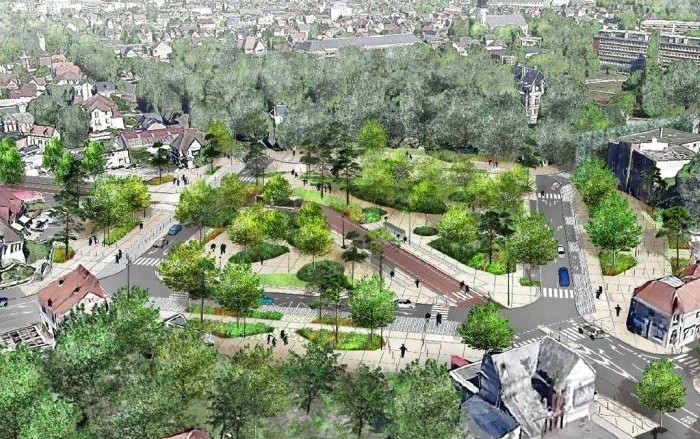 Mais cette ligne T4 ne traverse pas Sotteville, elle frôle juste la limite de la commune au niveau du Rond-Point des Bruyères, ou plutôt la « Place de Bruyères » puisque son nom a changé. En effet, après de gros travaux pour permettre le passage du Teor en son centre, sa forme est désormais carrée. Il n’existe pas pour l’instant de photo aérienne, mais on s’en rend bien compte sur la maquette du projet :