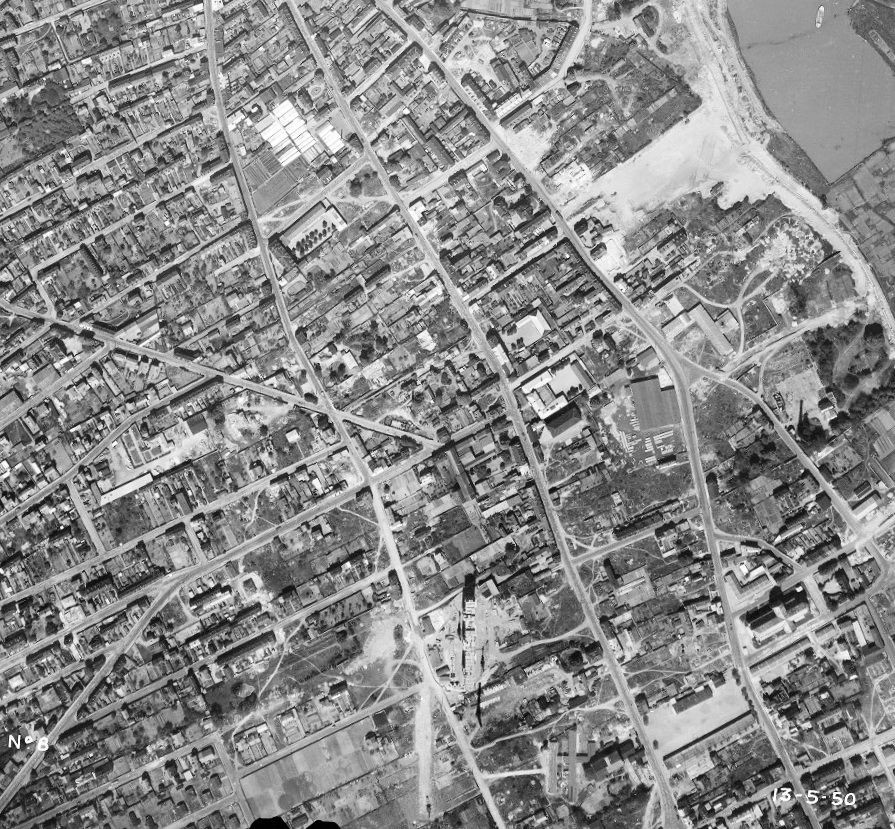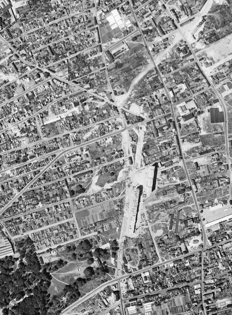 À ma connaissance, des photos « au sol » du percement de la rue Léon Salva prolongée n’existent pas. Et si c’est le cas, j’aimerais bien les avoir ! Heureusement que les photos aériennes de l’IGN sont là !