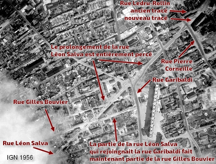 Sur cette photo de 1950, les transformations n’ont pas encore commencé. Il faut s’imaginer une ligne droite entre le carrefour des rues Gilles Bouvier et Léon Salva jusqu’à la rue Ledru-Rollin. C’est le futur prolongement de la rue Léon Salva que Marcel Lods (architecte-urbaniste qui a reconstruit le ville) se propose de créer.