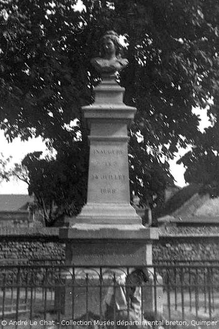 Suite à la publication de cet article, Catherine Troprès du Musée départemental breton a envoyé cette photo du buste de République (également prise par André Le Chat) sur lequel on peut lire « Inauguré le 14 juillet 1888 » :