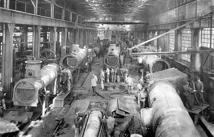 Cet atelier comporte trois halles : La plus petite est destinée aux machines-outils, les deux autres, à la construction des chaudières des machines à vapeur :
