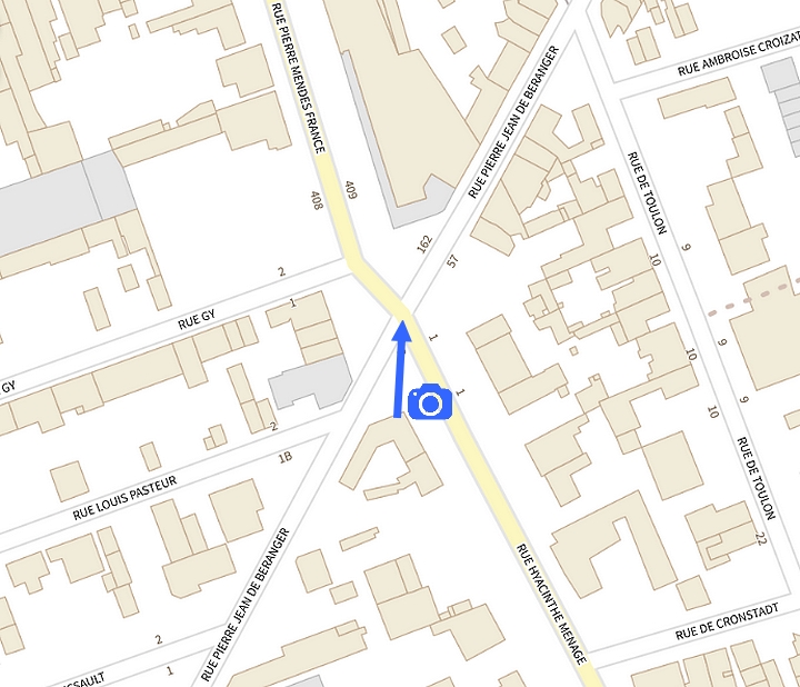 Ce tronçon de la rue Hyacinthe Ménagé s’appelle désormais « Rue Pierre Mendès-France ». Le carrefour Béranger a, lui aussi, été renommé « Place Charles de Gaulle ». Ces changements de noms sont intervenus dans les années 90, en même temps que la construction des immeubles sur cet îlot. Pour plus de détails à ce sujet, vous pouvez relire l’article « Avant la construction de la résidence Pierre Mendès-France ».