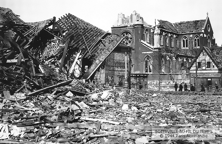 À la Une de son édition du 21 avril 1944, le « Journal de Rouen », qui était sous influence allemande (actuel « Paris-Normandie »), publiait cette photo du centre-ville, ou plus exactement de la place de la mairie. Vous pouvez aussi voir le journal sur le site des archives départementales.
